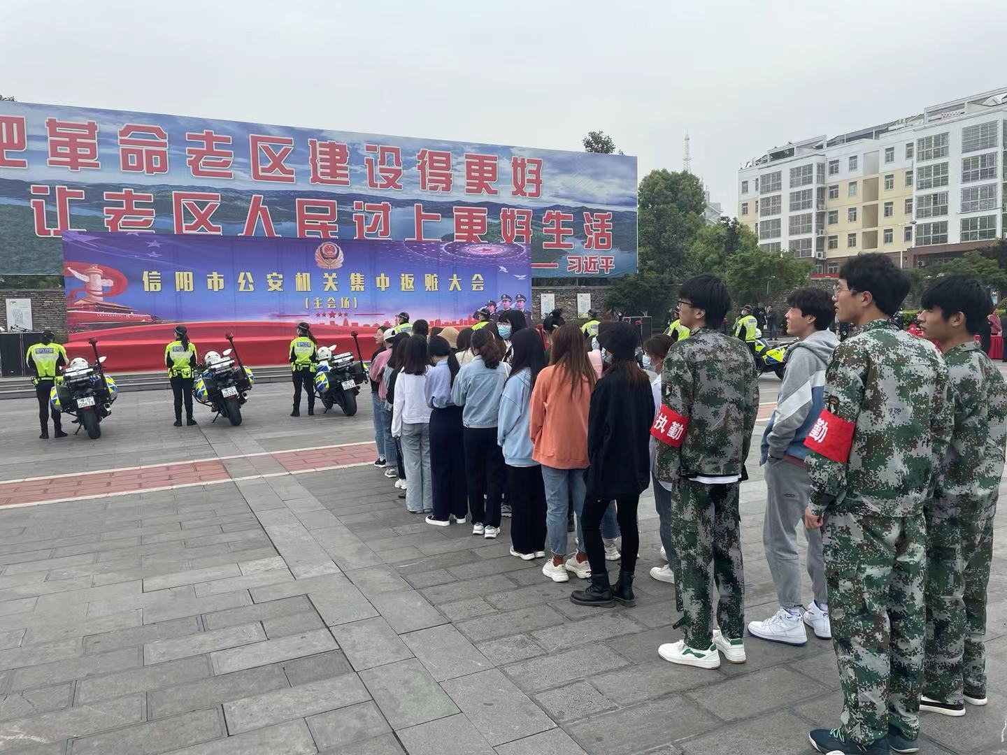 2021年4月27日上午,beat365在线平台官网校安全文明巡查队参加了在平桥区世纪广场举办的信阳市公安机关集中反赃活动。