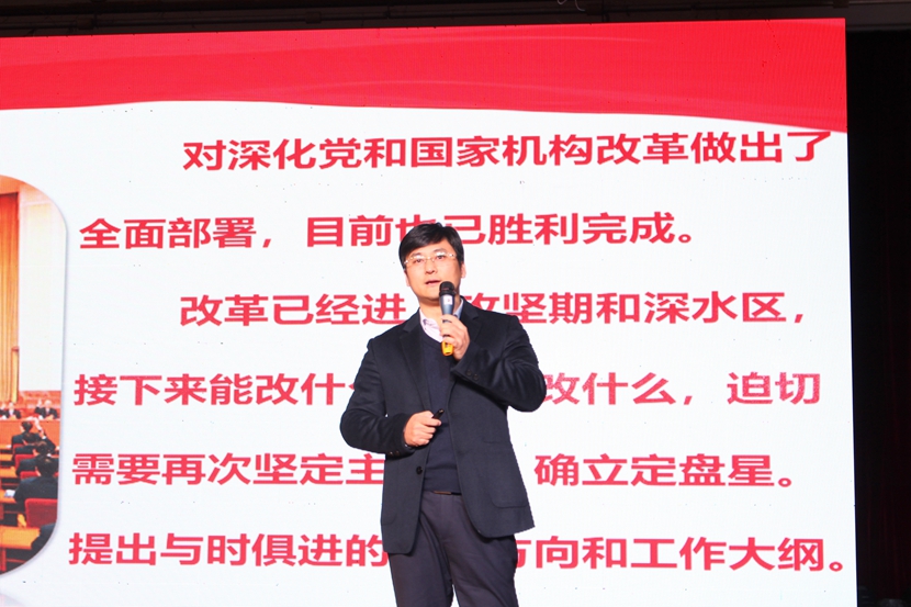 在宣讲中,张艳斌从中国密码、中国时机、中国优势、中国部署与中国青年五个方面紧扣党的十九届四中全会精神,结合十九届四中全会以来党和国家事业取得的伟大成就,深入浅出、全面系统地阐释了中国特色社会主义制度和国家治理体系的显著优势,并围绕全会通过的《决定》提出的总体要求、总体目标和重点任务进行了全面解读和深度剖析。