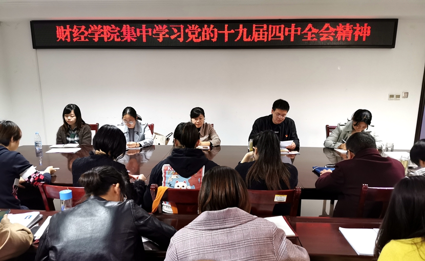 11月6日下午,在综合楼821会议室,财经学院组织全体教职工集中学习党的十九届四中全会精神,院党总支书记朱长明主持会议。