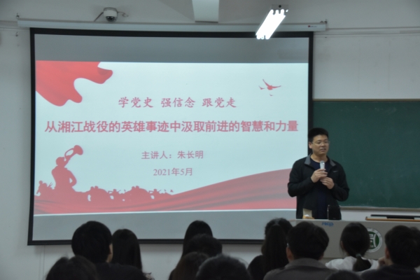 为进一步提高学生党员党性修养,坚定信念,加强党史学习教育, 5 月 17 日,财经学院党总支书记朱长明在二教103 为学生党员上了一堂题为《从湘江战役的英雄事迹中汲取前进的智慧和力量》的党史学习教育专题党课。