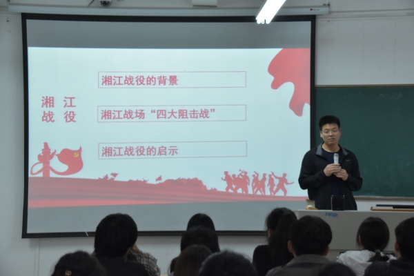 朱长明首先带领大家学习了习近平总书记4月25日考察广西参观红军长征湘江战役纪念馆时的讲话精神。随后,朱长明从湘江战役的背景、经过、历史意义及其伟大精神等多角度带领同学们重温了那段烽火岁月。接着,朱长明和同学们一起观看了电影《血战湘江》。