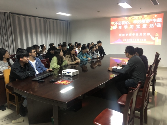 为学习贯彻习近平总书记在“不忘初心、牢记使命”主题教育工作会议的重要讲话精神,根据学院主题教育工作安排,10月16日晚财经学院学生党支部在行政楼821会议室开展“不忘初心、牢记使命”学习党章活动。活动由财经学院学生第一党支部书记段远飞主持,四个学生支部党员参加。