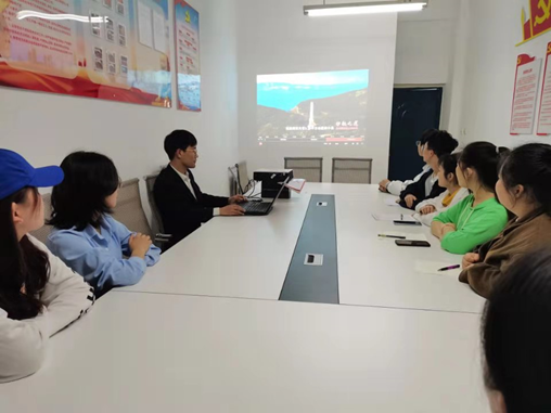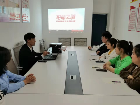 2021年4月15日晚20:00财经学院学生第三党支部书记曹雷欣老师在党员活动室组织观看《护航之道一总体国家安全观纵横》,与10名党员共同学习总体国家安全观。