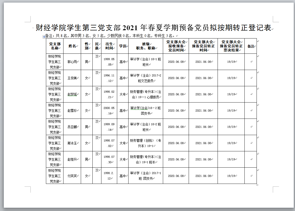根据《关于实行“双推双评三全程”进一步规范发展党员工作的实施办法》要求,现将郭心雨等8名预备党员转正的基本情况公示如下,请予监督。