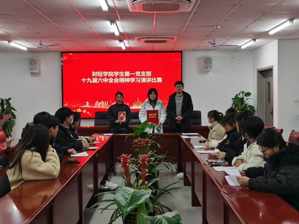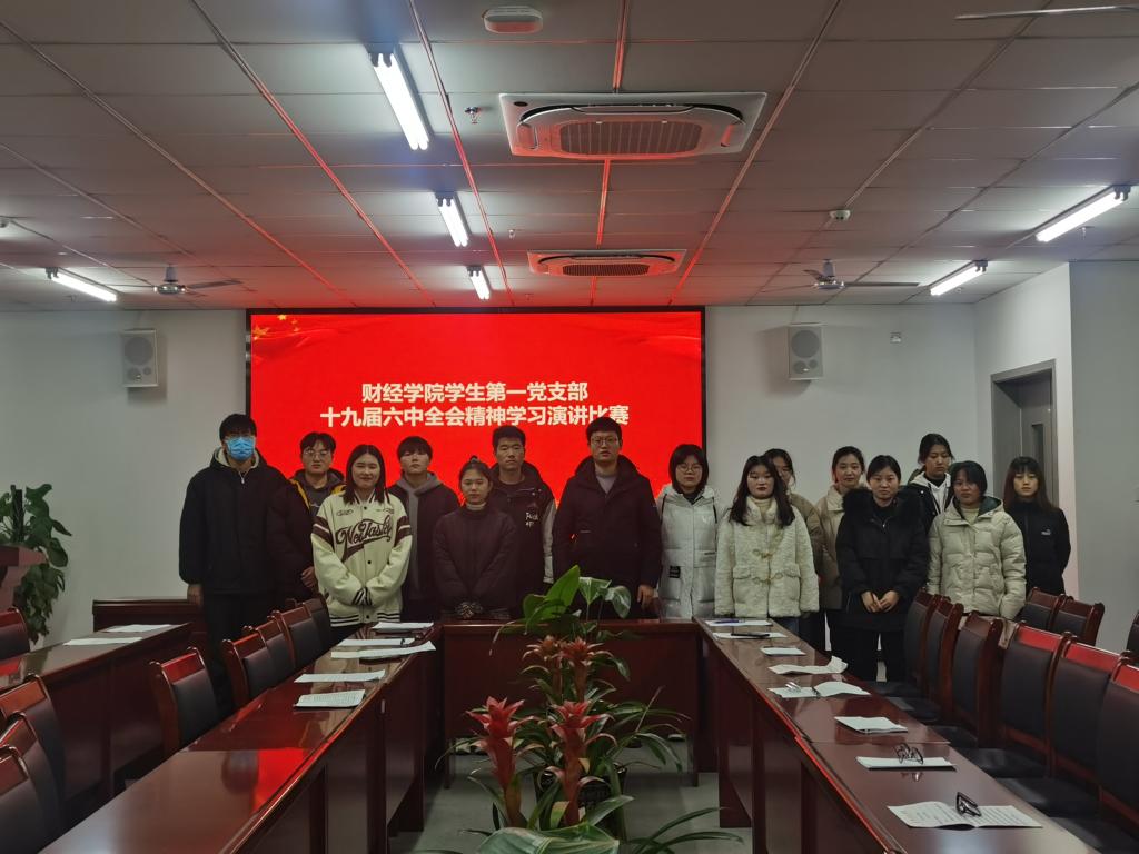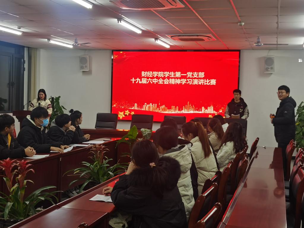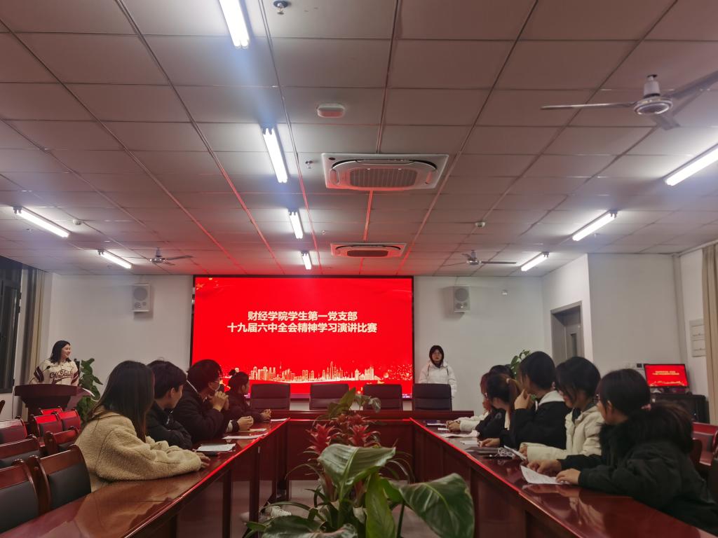 为贯彻落实党的十九届六中全会精神,推动党史学习教育走深走实,财经学院学生第一党支部于2021年12月15日在学院408会议室举办了学习十九届六中全会精神演讲比赛,支部正式党员、预备党员和入党积极分子代表参加。