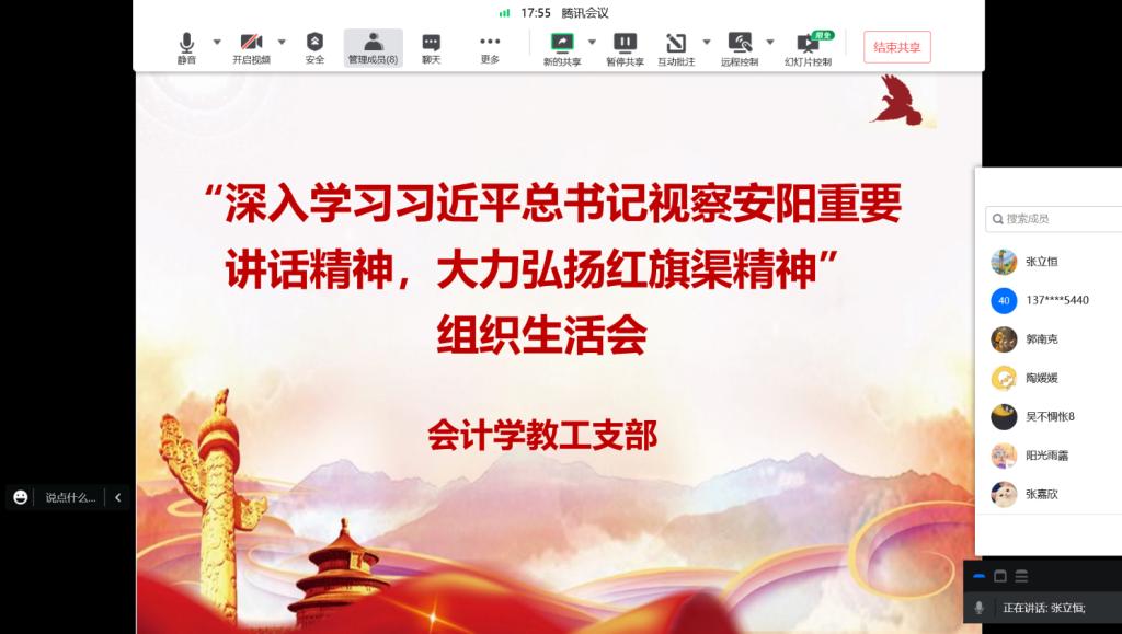 为深入学习贯彻习近平总书记考察河南安阳时的重要讲话精神,大力弘扬“自力更生、艰苦创业、团结协作、无私奉献”的红旗渠精神,11月22日,会计学教工党支部线上召开了“深入学习习近平总书记视察安阳重要讲话精神,大力弘扬红旗渠精神”专题组织生活会。