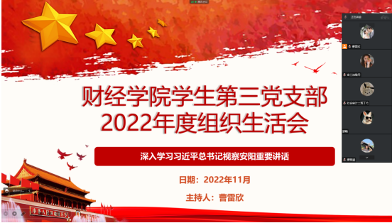 11月28日晚七点半,财经学院学生第三党支部召开了以“深入学习习近平总书记视察安阳重要讲话精神,大力弘扬红旗渠精神”为主题的专题组织生活会。支部书记曹雷欣以普通党员身份参加,并带头开展学习研讨。