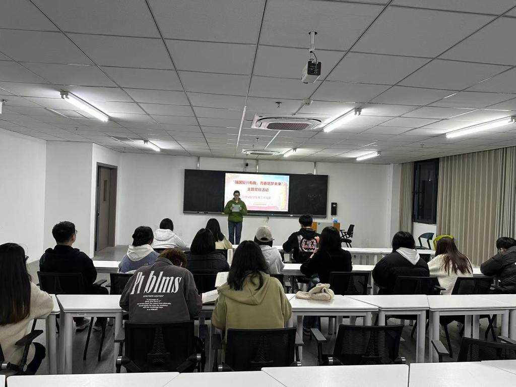 党日活动第一项由李彦泽、许梦瑶2位同志上台进行“强国复兴有我,青春筑梦未来”主题朗诵,喊出了“新时代的中国青年要以实现中华民族伟大复兴为己任,增强做中国人的志气、骨气、底气,不负时代,不负韶华,不负党和人民的殷切期望!”的青春誓言。