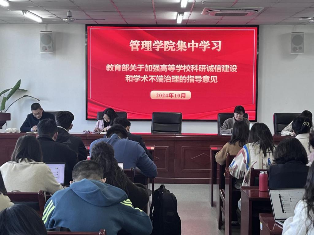 为深入贯彻党的二十大精神,加强科研诚信建设,营造风清气正、求真务实的良好学术生态和科研环境,10月22日下午,管理学院在双创中心408会议室召开了科研诚信警示教育会。本次会议由副院长仲照东主持,全院教师参会。