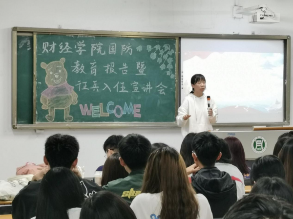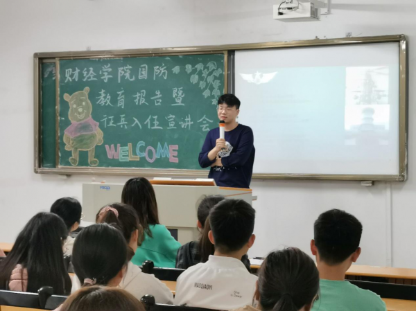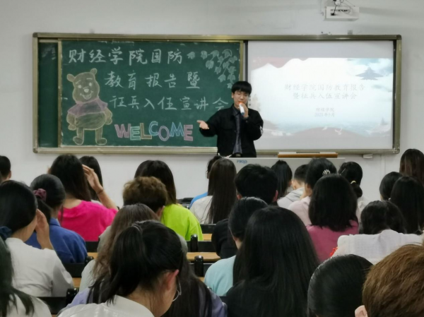 为响应国家号召,增强我院国防意识,激发广大同学们参军报国的热情。财经学院于2021年5月19日在2教102举办国防教育报告暨征兵入伍宣讲会,宣讲会由武装专干吴昊老师主讲。