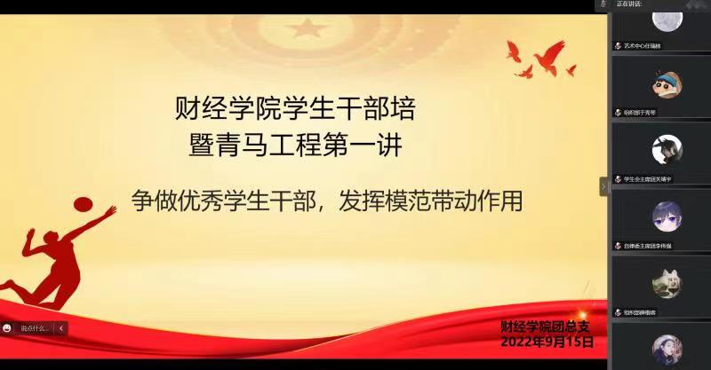 9月15日,财经学院召开学生干部线上云培训暨青马工程第一讲之做优秀学生干部,发挥模范带头作用,学院党总支副书记王艳平老师主讲,财经学院学生会主要学生干部、20级、21级各班班长和团支书参加培训。
