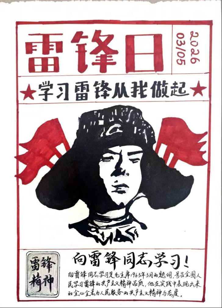 三月春风润心,薪火精神相传。为深入贯彻习近平总书记致中国志愿服务联合会第三届会员代表大会重要贺信精神,扎实推进“青春奋进‘十五五’志愿建功新时代”学雷锋主题活动,管理学院开展“丹青绘志愿,青春学雷锋”主题海报设计活动,鼓励师生以书画形式记录志愿瞬间、讲述雷锋故事,让雷锋精神在文艺创作中焕发新的时代光彩。