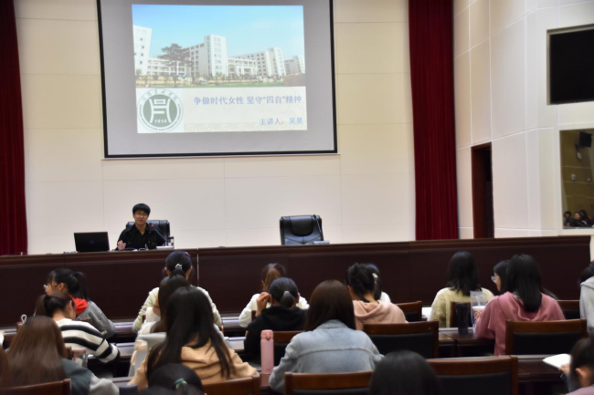 10月21日下午,在图书馆6楼报告厅,财经学院吴昊老师为2020级女生做了以“争做时代女性,坚守四自精神”为主题的入学教育报告会。