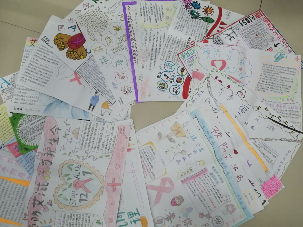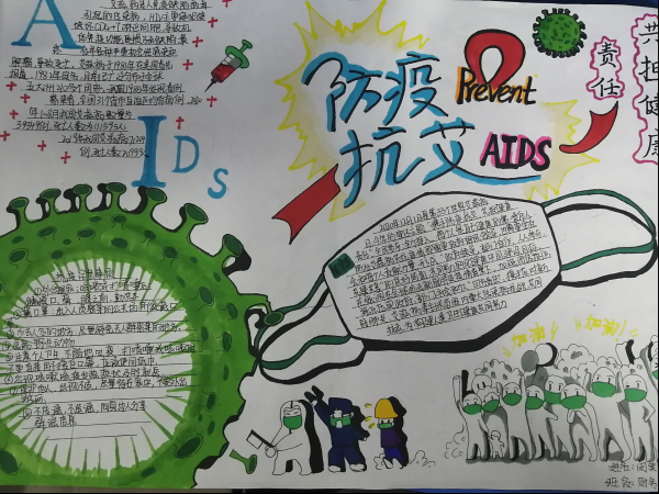 活动期间,各班心理委员及心理辅导部内部成员积极向同学们宣传防疫抗艾知识,同学们踊跃报名手抄报比赛,用心搜集资料、自主设计版面,尽情挥洒着真情的色彩,用自己的艺术才华向大家展示了他们对防疫抗艾的理解与实践,内容丰富,图文并茂。作品征集后心理辅导部通过对不同类型的作品进行分类和评比,从中挑选出一些有代表性的、富有创意的作品,对优秀作品发布奖品予以奖励,以鼓励大家把手抄报中的防疫抗艾精神传播下去。