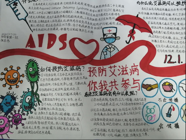 通过此次手抄报比赛,我院学生进一步了解到艾滋病传播的途径和预防措施,明确了在疫情防控的过程中如何进行自我保护,让“青春有爱,校园无艾”的理念更加深入人心,同时体现了学院对此次活动的高度重视。(财经学院 荣翊贝)