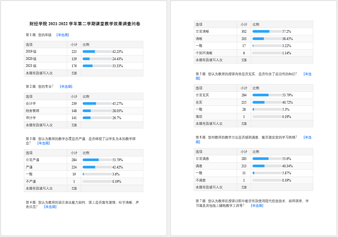 为深入了解当前教学运行的基本情况,掌握学生对课堂教学的适应度和满意度,财经学院于4月1日-5日在全院学生中开展了2021-2022学年第二学期课堂教学效果调查。通过问卷星回收有效问卷528份,基本覆盖所有参与教学的学生。