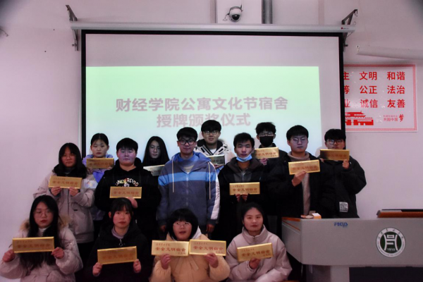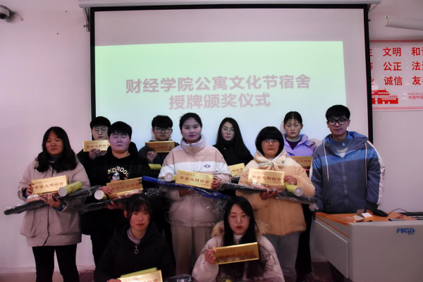 为进一步打造安全文明宿舍、保障和谐稳定的宿舍文化氛围,财经学院于2020年12月31日12时在二教406举办了公寓文化节宿舍授牌颁奖仪式。辅导员吴昊老师主持授牌颁奖仪式,财经学院相关负责部门以及获奖宿舍学生代表参加了本次仪式。