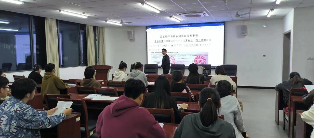 为进一步宣传国家助学贷款政策,提高同学们的诚信借贷意识,推进2023-2024学年高校助学贷款工作的顺利进行,2023年11月7日,财经学院在408举行了国家助学贷款合同签约仪式暨诚信培训会,我院资助专员毛帅老师和高校助学贷款学生参加了本次会议。