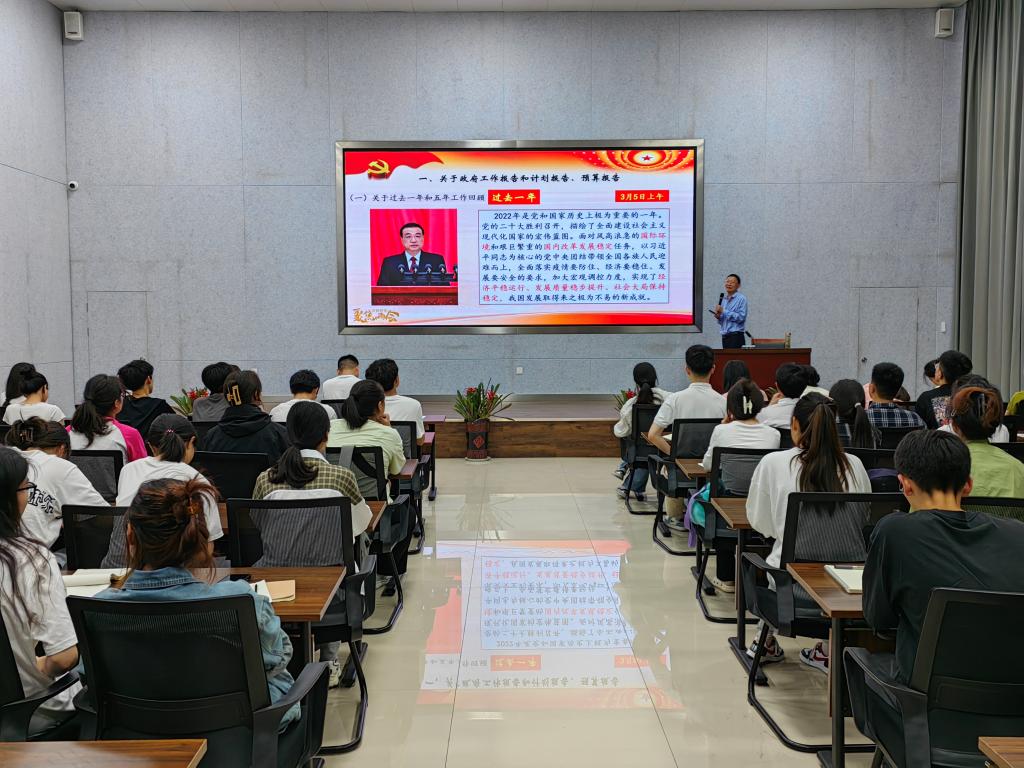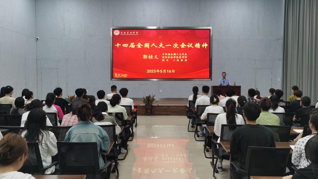 郭桂义结合参会经历,介绍了十四届全国人大一次会议召开盛况、主要议程、大会选举情况等,重点传达了全国两会期间习近平总书记在参加江苏代表团审议、看望民建工商联界委员、出席解放军和武警部队代表团会议、在十四届全国人大一次会议上重要讲话精神;传达了大会通过的各项报告的主要精神;河南代表团的履职情况以及他本人参会履职的深切体会和感受。他还特别向同学们介绍了河南代表团的五位80后、90后年轻代表和三位茶界代表的基本情况,进一步提振了广大青年学子的奋发作为的精神,激励他们努力学好科学文化知识,提高个人实践技能,在行业做出突出贡献,以实际行动为谱写中国式现代化新篇章增光添彩。