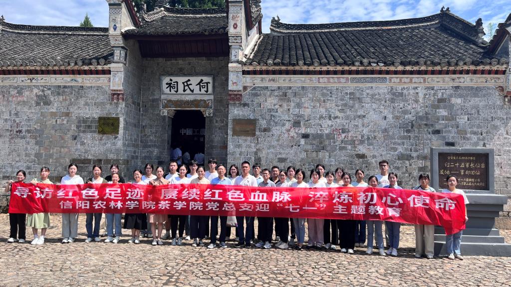 为庆祝中国共产党成立102周年,推动学习贯彻习近平新时代中国特色社会主义思想主题教育走深走实,6月30日,茶学院党总支师生党员在茶学院院长、党总支书记郭桂义的带领下,走进罗山县何家冲红色教育基地——红二十五军的长征出发地,开展“寻访红色足迹 赓续红色血脉 淬炼初心使命”迎“七一”主题教育。