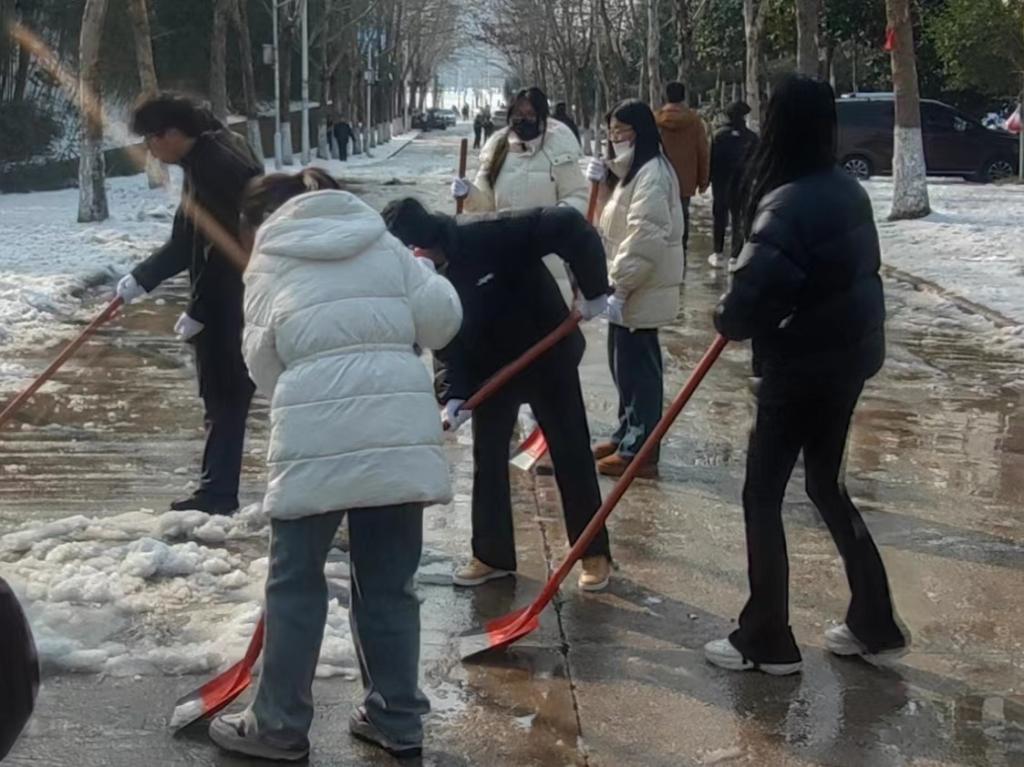 在面对寒风凛冽,冰天雪地,学生党员和入党积极分子干劲十足,分工明确,相互配合清理校园里的积雪和冰块,保障校园环境的整洁和安全,为师生的出行开辟出一条安全的道路。