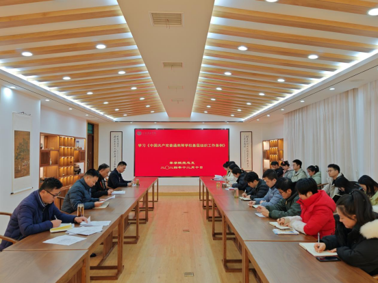 为扎实做好基层组织工作,提升党员干部的政治素养与责任意识,为学院发展提供坚实的政治保障。12月10日,茶学院党总支于科技楼1C201组织全体教师党员学习《中国共产党普通高等学校基层组织工作条例》(以下简称《条例》)。会议由茶学院党总支书记王鹏主持。
