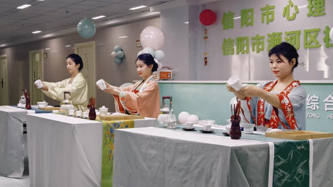 在活动现场,茶学院师生以“正念茶饮”为主题呈现了一场融合传统与疗愈的文化体验。学院教师周银银通过对茶文化知识的讲解,带领观众追溯信茶毛尖的历史脉络,解读中华茶道中“以茶养心”的精神内核;学生团队以行云流水的传统茶艺表演,将“静、和、美”的茶道境界具象化。信阳市第六人民医院临床心理科主任万帅从科学角度剖析正念疗法,阐释茶饮与正念结合对焦虑、抑郁等情绪调节的协同作用。活动高潮中,与会者闭目轻嗅茶香,在张维梁医生的引导词中感受呼吸与茶汤温度的共鸣,通过沉浸式品茗体验完成了一次身心疗愈之旅,让传统文化与现代心理科学在杯盏间达成奇妙交融。