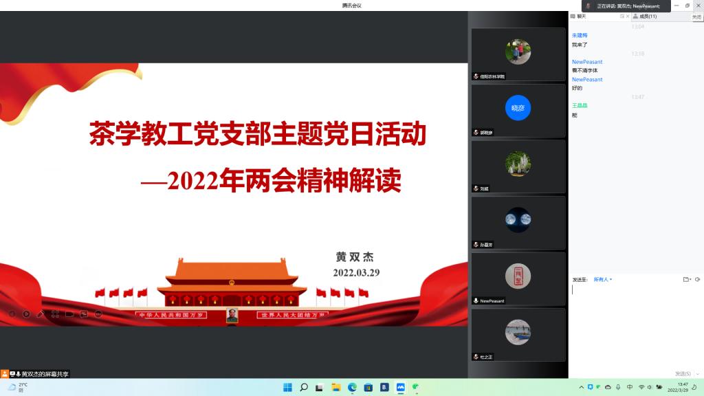 3月29日下午,茶学院茶学教工党支部书记黄双杰通过腾讯会议线上带领支部成员对2022年两会精神进行了深入学习。