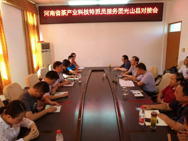 对接座谈会上,茶产业科技服务团团长郭桂义首先对科技服务团成员、服务的内容等情况进行了介绍,茶产业科技团服务不同与以往的“三区人才”科技服务,由三区科技人才的个人对企业或合作社、点对点的科技服务,还为服务团面向茶产业全产业链服务,开展包括茶叶技术、品质鉴定、营销、茶艺、茶文化的服务,光山县茶企业任何技术需求都可以和我们联系,即使我们团队不能解决的我们尽可能寻找外援帮助茶企业和单位解决技术,其过程不收取任何费用;光山科技局局长向晖首先对茶产业科技服务团的到来表示感谢和欢迎,并表示在今后的服务中,将做好茶企业和公司需求信息的收集,同时指派专人做好服务团成员与企业之间的联络和沟通工作;光山县茶办主任张国善就光山县茶产业发展现状和需要解决的问题进行了简要的介绍,并表示在今后茶产业科技团服务过程中做好服务工作,企业与科技特派员之间的沟通与协调工作,并就下一阶段服务工作的开展提出了建设性意见。