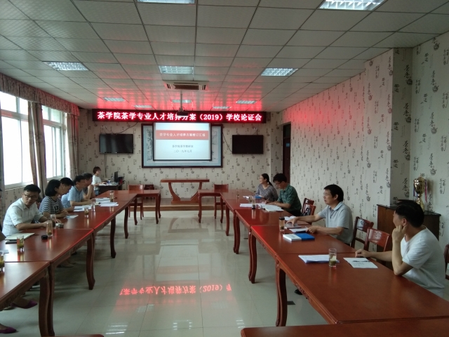 7月4日,茶学院在1c201组织召开2019版茶学、茶学(茶文化与营销)、茶学(对本)人才培养方案学校论证会,副校长赵一鹏,教学质量监控与评估中心主任王学增,科技处处长赵聘,教务处副处长张淮,茶学院院长郭桂义、党总支书记袁丁、教学秘书陈义、教研室主任刘佳、张洁、组织员朱建梅,办公室主任池水婧、刘威、尹鹏、王子浩、杨转等专业教师参加论证会,论证会由院长郭桂义主持。