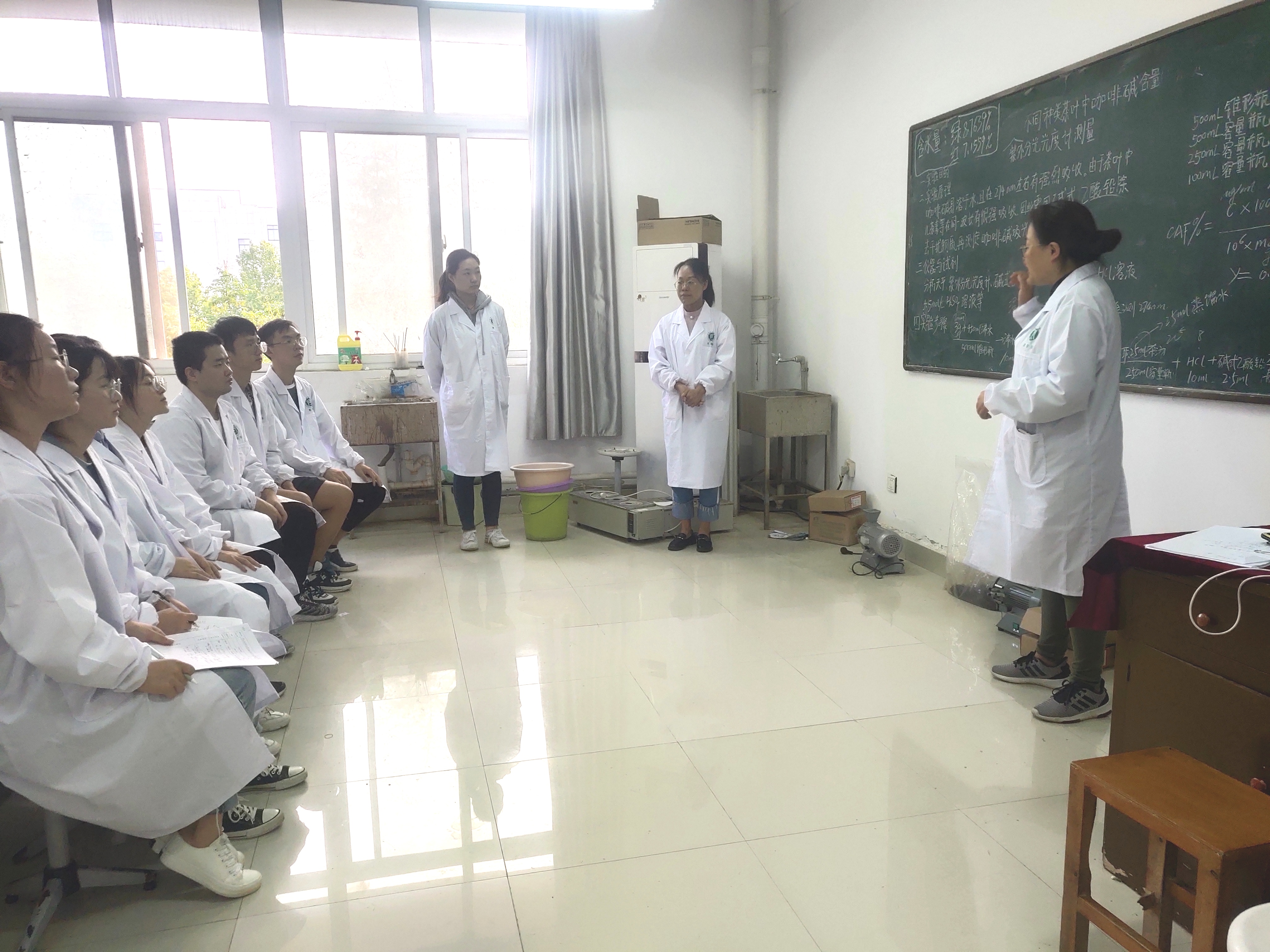 本次实习茶叶样品使用2017级本科《制茶学》实训周加工的红茶与绿茶,对茶样中的水分、水浸出物、茶多酚、氨基酸、咖啡碱等品质成分进行了测定及分析,整个实习分班分组进行。通过实习让同学们掌握和熟悉茶叶化学成分测定方法及相关仪器的使用,进一步理解加工工艺对茶叶化学成分和品质的影响。