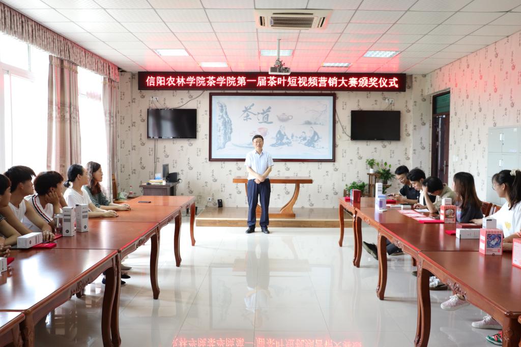 7月8日中午,在1C501举办了第一届茶业短视频营销大赛颁奖仪式。茶学院院长郭桂义、茶学院党总支副书记朱建梅、茶学院茶文化与营销教研室教师池水婧以及专任教师夏雨、朱尧、杜之正、王晶晶出席了颁奖仪式。郭桂义院长为获得一等奖的同学颁奖并做总结发言,郭院长对获奖的同学表示祝贺,并鼓励同学们再接再厉,在学习过程中勇于尝试、不断创新。郭院长还指出,通过以赛促学、以赛促练的方式,可以更好的提升同学们的实践能力,激发同学们的学习和创作热情。
