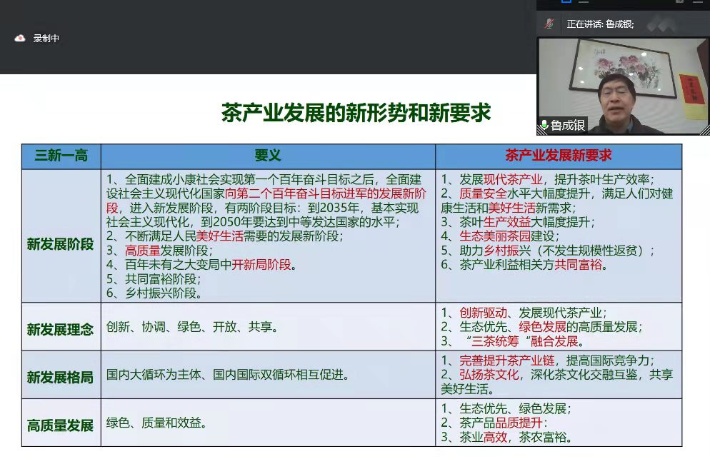 按照培训方案,科技部中国农村技术开发中心主任邓小明为培训班做了开班报告。随后,中国农村技术开发中心胡熳华处长、安徽农业大学宛晓春教授、中国农业科学院茶叶研究所鲁成银研究员、福建农林科技大学孙威江教授、全国供销合作总社杭州茶叶研究院张士康研究员、福建农林大学廖红教授等专家学者从不同角度为培训班学员授课。在全国茶产业骨干科技特派员专题培训班中,来自河南、浙江、福建、江西、安徽、四川、云南、陕西等重点产茶省份茶产业骨干科技特派员、茶产业重点龙头企业负责人共计100余人,将通过视频会议学习习近平总书记对科技特派员工作的系列重要指示精神和对“茶文化、茶产业、茶科技”统筹发展的指示精神;学习优秀茶产业科技特派员工作方法与实践案例;云上考察武夷山茶园、加工企业、科技特派员示范基地,并研讨交流。