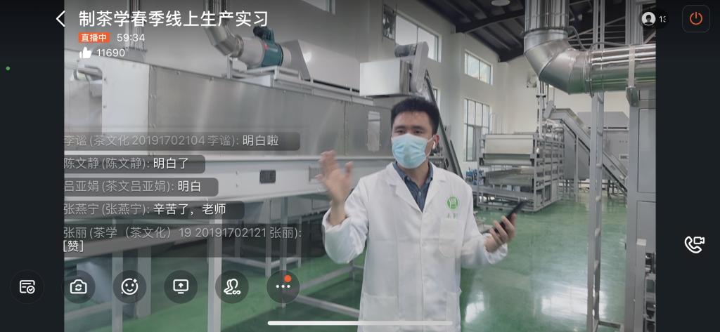 在本次线上课外实践教学中,陈义老师向同学们详细的介绍了信阳毛尖传统工艺的制作技艺;王子浩老师向同学们介绍了信阳毛尖全自动化生产线以及信阳红茶全自动生产线;随后,几位老师又给同学们展示文新茶叶加工园区茶园生态环境,让同学们了解从生态环境到原料再到加工工艺造就了信阳毛尖优异的品质特征。实践教学期间,陈义老师和王子浩老师告诉同学们我们不仅要传承好传统手工信阳毛尖加工工艺这一国家级非物质文化遗产,也要与时俱进,不断进行科技创新,为信阳毛尖提质增产甚至信阳茶产业的发展不断努力。