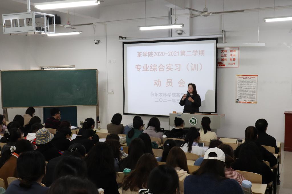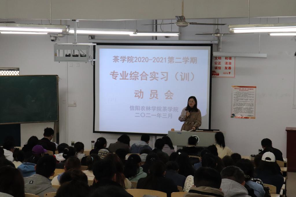 3月23日中午,茶学院在2教304召开2018级茶学(创新拓展)、2018级茶学(茶文化与营销)、2018级茶学(对口)、2020级茶学(专升本)及2019级茶艺与茶叶营销专业综合实习(训)动员会,动员会由茶学副院长孙慕芳主持。茶学院院长、党总支书记郭桂义教授、副院长陈义、党总支副书记朱建梅、茶学实验教学中心主任尹鹏、教学秘书张永瑞、辅导员池水靖、杨转、梁玉洁等教师参加了此次动员会。本次专业综合实习(训)涉及216名学生,67家茶企,其中包括了11处校外实习基地。