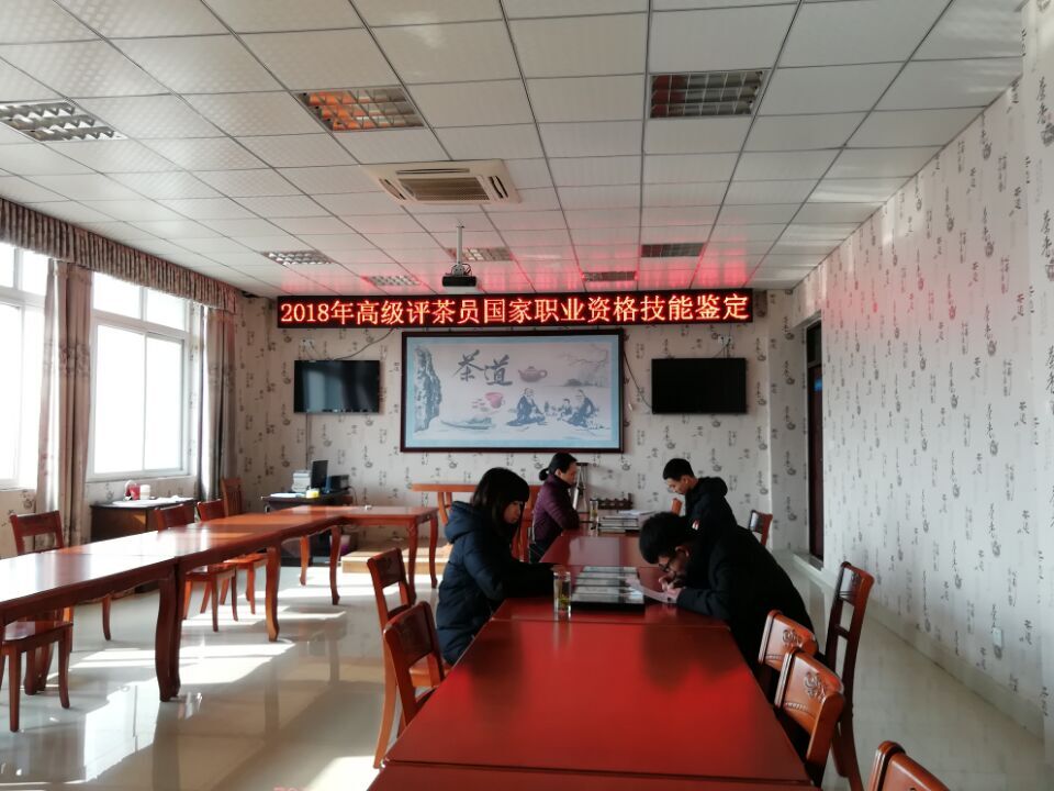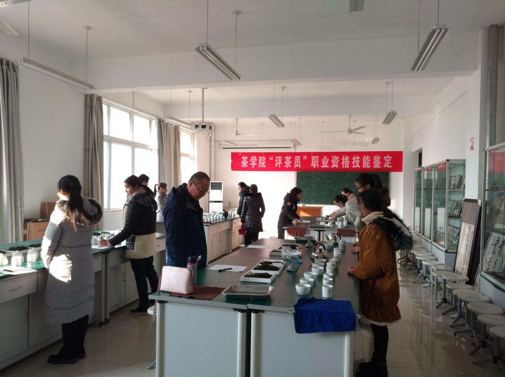 2018 年12月14日,茶学院与信阳市人力资源与社会保障局就业训练中心联合组织开展了“高级评茶员”国家职业资格鉴定。茶学院2015级茶学1班、2班、2015级茶学(茶文化与营销)、2016级茶树栽培与茶叶加工、2016级茶艺与茶叶营销1班、2班共110名本专科同学参加了鉴定。茶学院专业教师张洁、刘威和市就业训练中心工作人员担任考评员,专业教师陈义、刘佳、池水婧、张永瑞、杨转、常亚丽参与了鉴定考务工作。