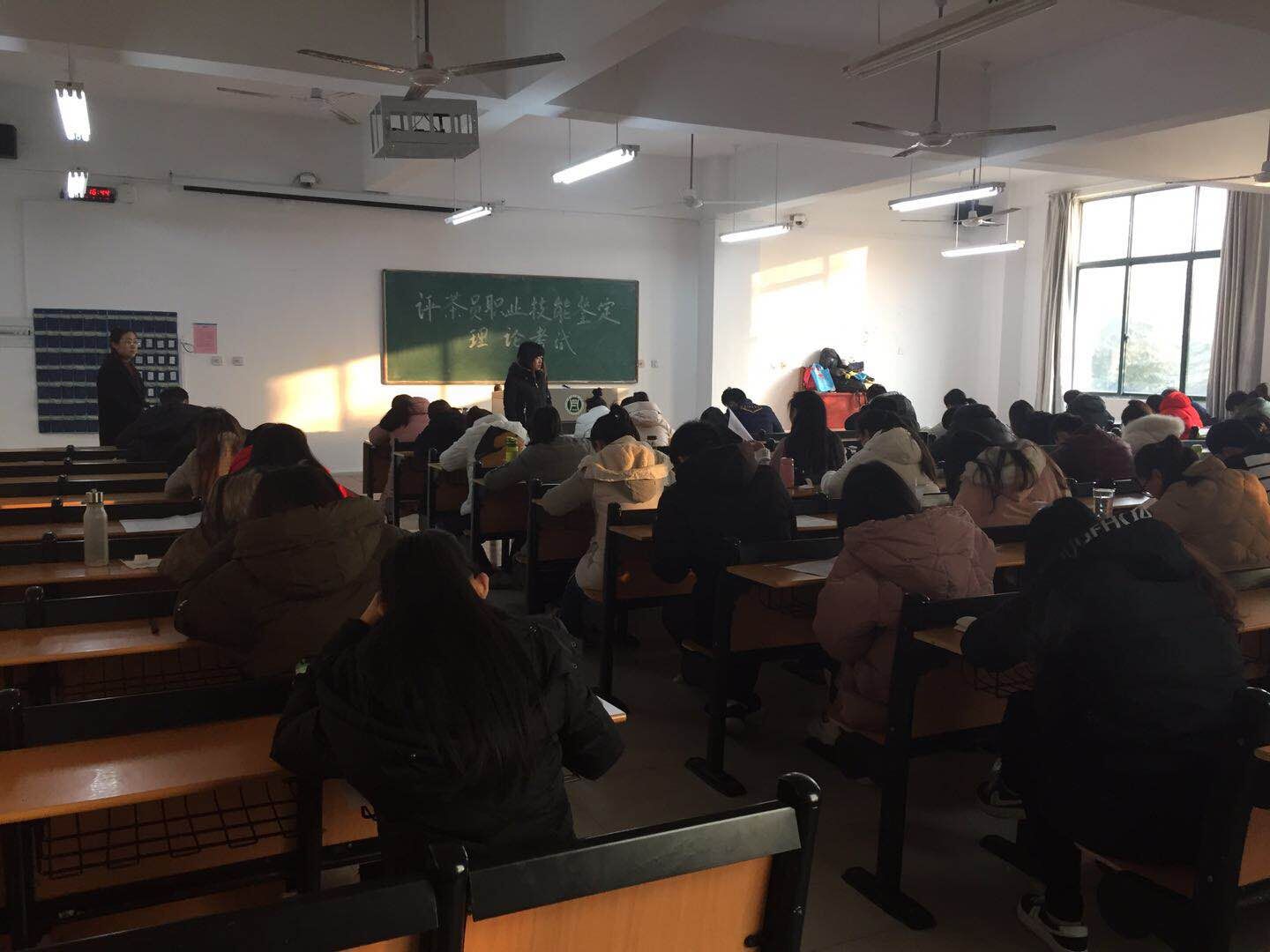 高级评茶员国家职业资格鉴定分为理论和技能考核两部分,其中理论考核在2教103、109两个教室进行,每个考场3名监考教师;技能考核在茶学院茶艺室和茶叶审评实验室进行,考核内容涵盖茶叶标本识别、六大茶类感官审评、茶叶知识问答等多方面。整个鉴定持续了近7个小时,信阳市人社局培训教育科科长杨立明、人社局教研室主任杜丽华、市就业训练中心主任朱文力和茶学院党总支书记袁丁等对理论及技能考核现场进行了巡视。通过“高级评茶员”技能考核的开展,考查了学生的专业综合知识、专业基础技能及创新能力,强化了学生的技能训练,提升了学生的就业竞争力。