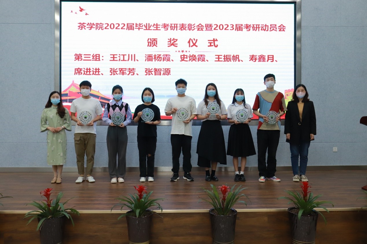 行而不辍,未来可期 —茶学院于2022年5月20日下午在学术交流中心多功能报告厅举行2022届毕业生考研表彰暨2023届考研动员会。茶学院党总支书记、院长郭桂义、党总支副书记朱建梅、副院长陈义、团总支书记王子浩、茶学实验中心主任尹鹏、茶文化与营销教研室副主任王杉、茶学(专升本)20班辅导员杜之正及受表彰的2022届考研学生和2023届拟考研学生代表参加了大会。会议由副院长孙慕芳主持,分毕业生考研表彰、拟考研学生代表发言、考研宣誓、老师寄语四个阶段。