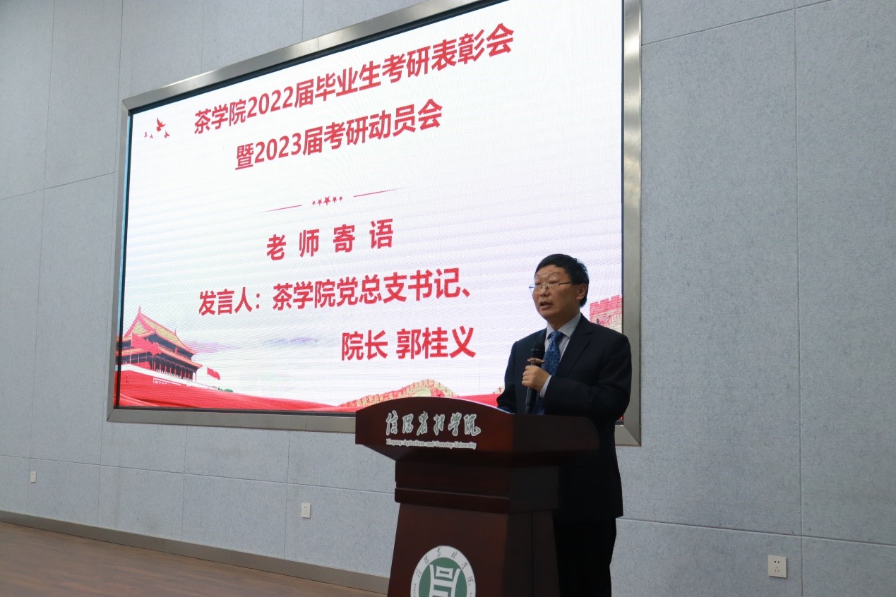 最后,茶学院党总支书记、院长郭桂义寄语同学们:2022届毕业生以此为起点,为自己、为家庭奋发图强、为母校增光添彩、为中华民族伟大复兴贡献自己的绵薄之力。无论走到哪里,走得多远,希望你们永远记得母校,记得你们是学校的名片,祝愿同学们成为学校的金色名片;2023届考研同学们从今天开始,在未来的六个月里,厚积薄发,努力拼搏;路不险,无以识良马;任不重,无以识英才。希望大家拼搏六个月,以自信、坚毅的状态面对考研的挑战!
