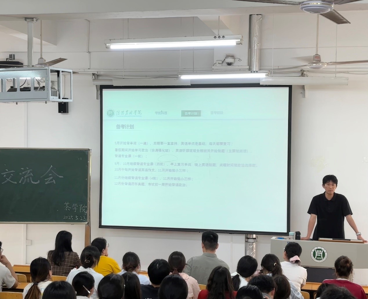 为助力2026届茶学专业学子科学规划考研复习、打破考研信息壁垒、提升备考效率,5月23日下午,茶学院于2教206成功举办2025年考研经验交流会。本次活动由茶学院党委副书记王子浩、辅导员王晶晶苏丹、陈凌芝、王利妍、11名2025届考研学生代表及100余名学生共同参与,现场气氛热烈,干货满满。