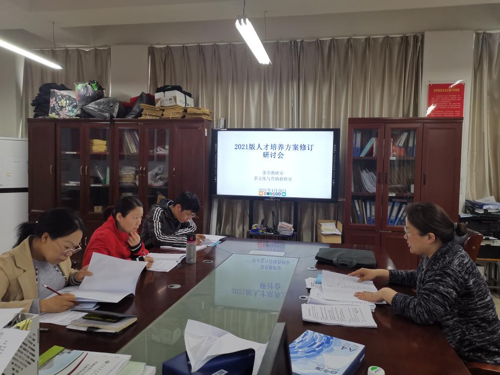 2021年4月20日下午,茶学院茶学教研室和茶文化与营销教研室在2C501召开“2021版人才培养方案修订研讨会”及整改落实第一督导组检查时提出的人培修订的建议,茶文化与营销教研室主任刘佳、茶学教研室主任刘威、茶学教研室副主任杨转等参加本次研讨会,研讨会由教学副院长孙慕芳主持。 研讨会上,大家对茶学19版人培中的矩阵进行再次论证研讨,并就是否增设专业限选课和专业任选课进行了商讨,一致同意扩大限选课(1:1.5)和专业任选课门数(1:2);同时学习了浙江农林学院、湖南农业大学、山东农业大学、华南农业大学最新茶学人培方案,对2021版beat365在线平台官网茶学人培拟开设的专业限选课和专业任选课进行了商讨,初步确定开设具有新农科理念等学科交叉融合的课程,开设国家乡村振兴等专题讲座等,毕业实习和毕业论文拟从原来第8学期,修改为第7-8学期开展。(茶学院 杨转)