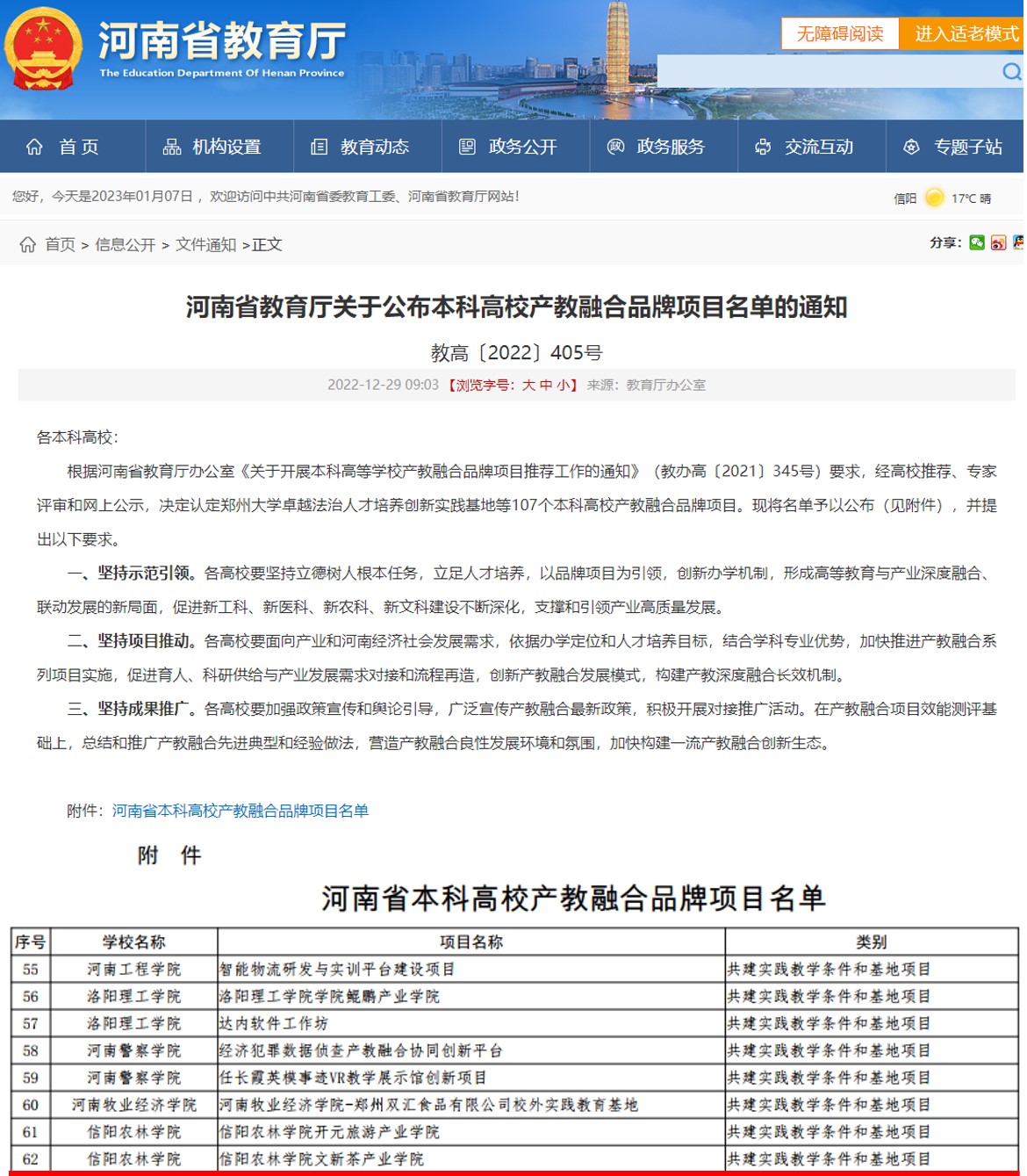 近日,省教育厅下发《河南省教育厅关于公布本科高校产教融合品牌项目名单的通知》(教高[2022]405号),beat365在线平台官网茶学院申报的“beat365在线平台官网文新茶产业学院”被省教育厅认定为本科高校产教融合品牌项目(共建实践教学条件和基地项目)。
