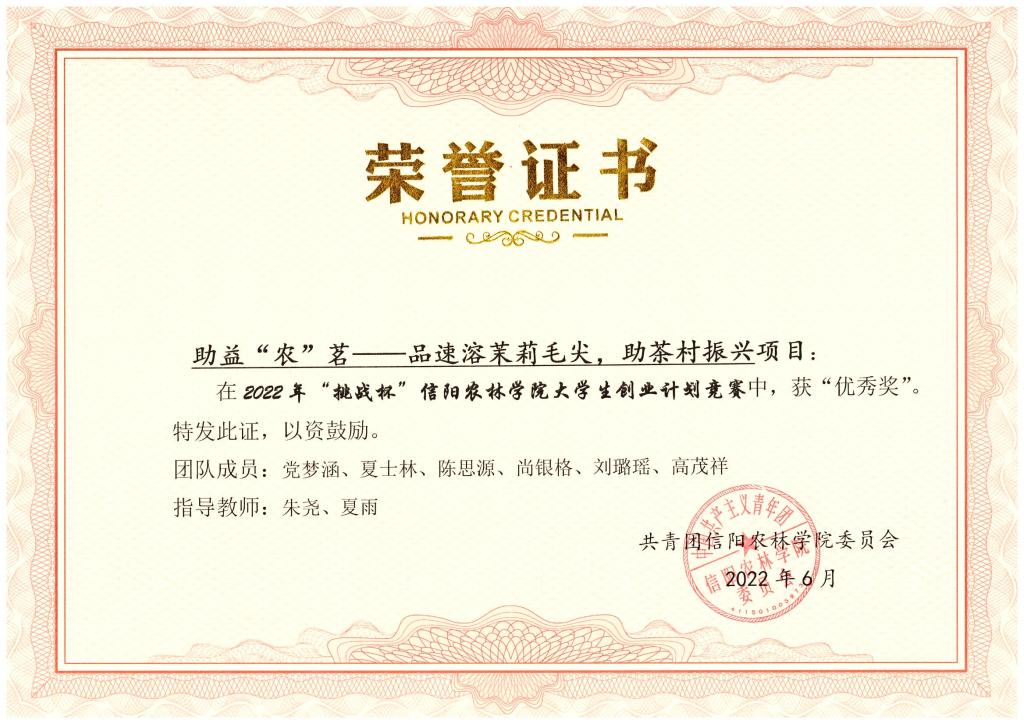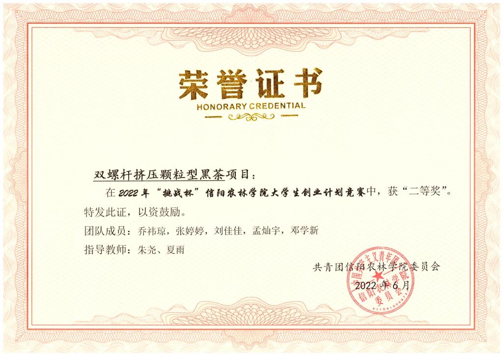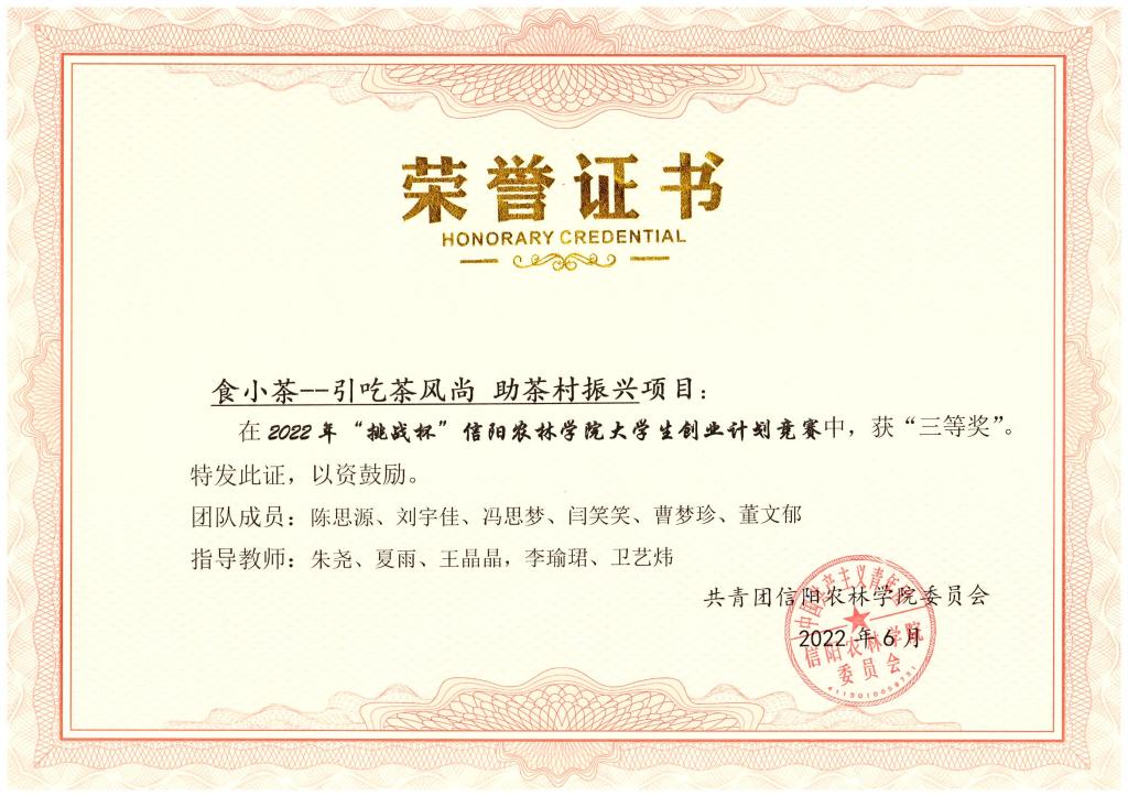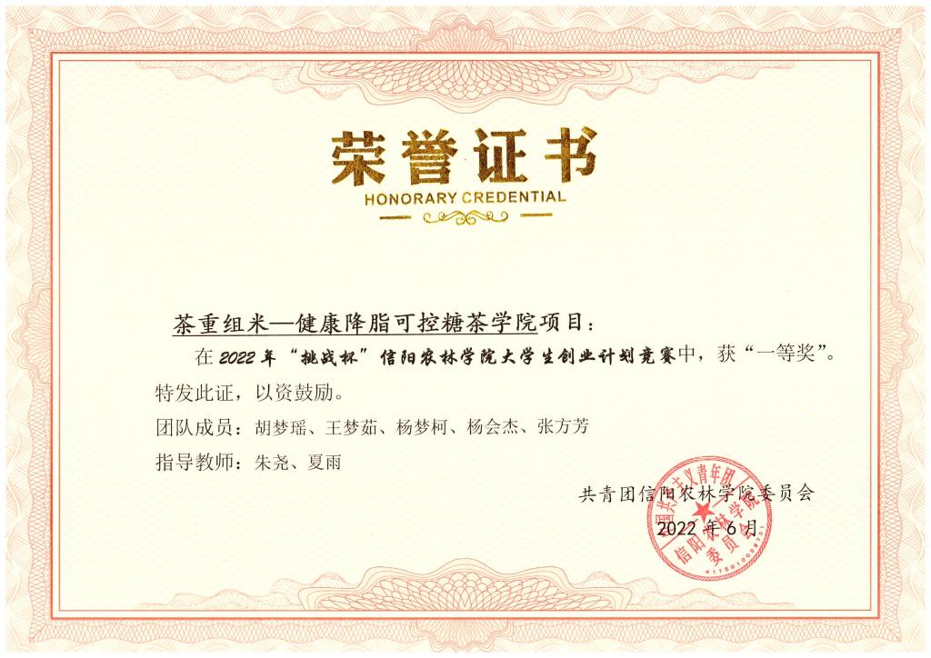 beat365在线平台官网2022年“挑战杯”大学生创业计划竞赛于2022年5月份举办,茶学院积极动员和鼓励师生参加,并最终取得了优异的成绩。胡梦瑶等5位同学参赛的项目“茶重组米——健康降脂可控糖”获得一等奖;乔祎琼等5位同学参赛的项目“双螺杆挤压颗粒型黑茶”获得二等奖;陈思源等同学参赛的项目“食小茶——引吃茶风尚,助茶村振兴”获得三等奖;党梦涵等同学参赛的项目“助益农茗,品速溶毛尖,助茶村振兴”获得优秀奖。