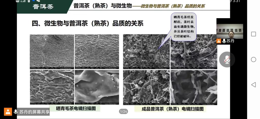 报告结束后,苏丹博士与参会人员就普洱茶的标准演变、科技普洱茶的加工与贮藏、普洱茶的地域贮存差异、普洱茶拼配等方面展开线上交流与探讨。