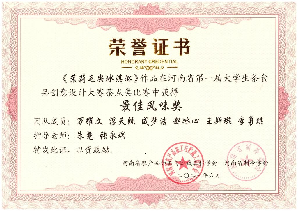 我院朱尧、张永瑞、夏雨老师指导的《茉新毛尖冰淇淋》获得最佳风味奖与二等奖。