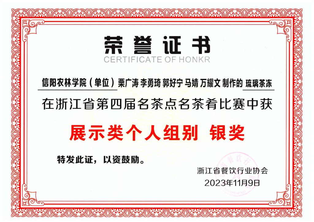 我院教师朱尧带领“食小茶”创新创业团队学生参与了本次茶奥会的“全国名茶点(名茶肴)大赛”与“新式茶调饮赛”。在朱尧老师的悉心指导和参赛学生的努力拼搏下,斩获国赛铜奖1项、省级银奖1项以及优胜奖1项,其中马婧等同学的茶冻冰酪作品获全国名茶点(名茶肴)大赛展示类团体组铜奖、栗广涛等同学的琉璃茶冻作品获浙江省第四届茶点名肴比赛展示类个人组别银奖以及李勇琦等同学的岁月静好作品获新式茶调饮赛“茶+特调”组优胜奖。期间,朱尧老师接受了浙江电视台经济生活频道的采访。