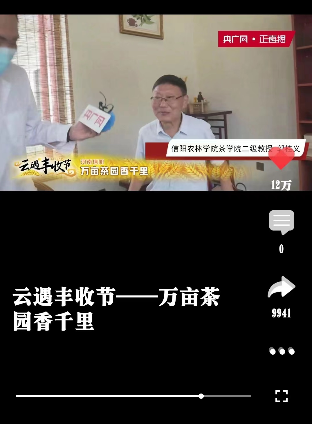 9月20日,央广网“云遇丰收节·千里‘绘’丰收”系列直播之“云遇丰收节 万亩茶园香千里”走进河南省信阳市浉河区,茶学院院长、河南省茶产业科技特派员服务团团长郭桂义教授应邀参加直播活动。结合活动主题,郭教授从信阳毛尖基本品质特征、泡茶用水和茶叶审评方法等方面作了专业介绍。