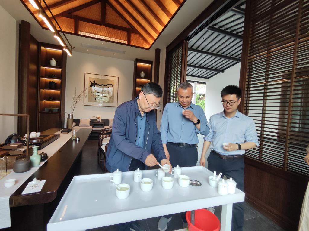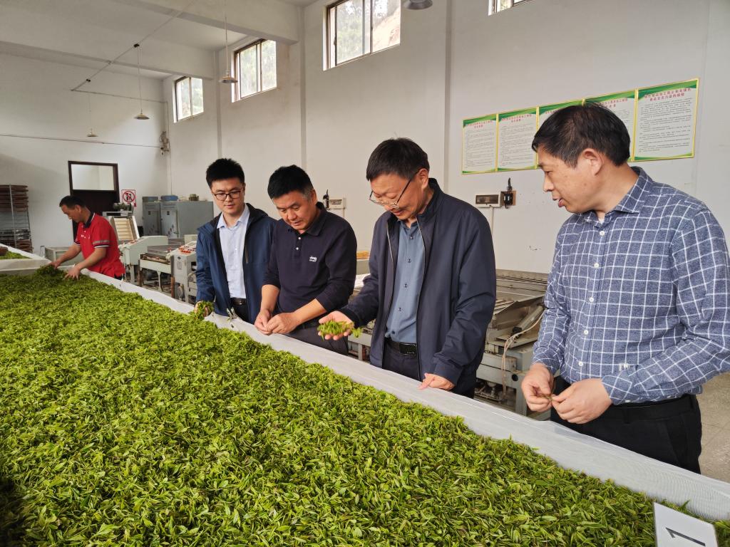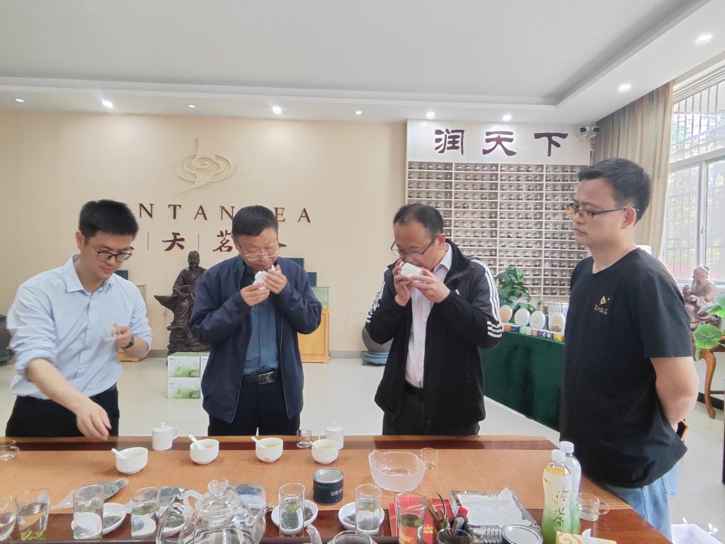 在河南蓝天茶业有限公司,郭桂义教授与公司负责人任文波就信阳毛尖和信阳白茶的产量和销售情况进行了交流,并现场审评了多款信阳毛尖茶样,从感官审评的角度结合茶叶加工工艺,针对性的提出改善茶叶品质的技术建议。针对白茶的萎凋方式,郭桂义教授等提出企业应注意白茶加工过程中的萎凋方式,避免茶叶红变。在光山县寨河镇杜岗村春晖农业,服务团一行考察了信阳毛尖加工数字化生产线,并审评了由白毫早、白叶1号、黄金芽、奶白茶等不同茶树品种加工的绿茶,郭桂义教授建议要综合考虑不同茶树品种鲜叶的物理特性、生产设备稳定性等因素采取相应的加工技术;同时建议企业采用专业的感官审评方法科学评价茶叶品质,不断优化制茶技艺,注意把控火工温度。服务团表示后期可以加强产学研深入合作,共同探索自动化生产信阳毛尖茶品质提升。