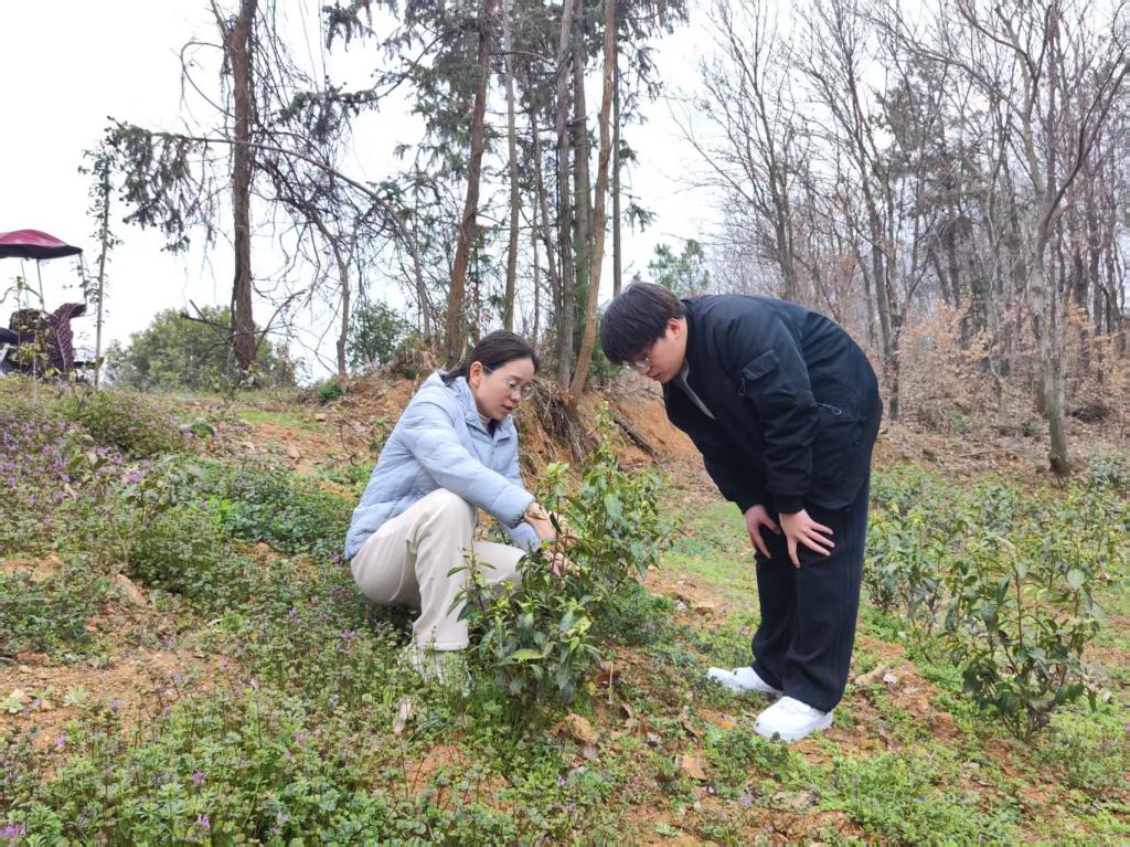 在公司茶产品展示厅布局方面,张向娜建议展示厅的布局应充分考虑游客的参观体验,产品陈列要突出产品特色,同时设置企业文化墙、VR体验区和品茗区,邀请游客品尝公司自主研发的各类茶产品,提升游客的参与感和满意度。作为“科技副总”,张向娜针对公司现有的黄金绿茶、红茶、白茶等产品,建议进一步挖掘茶叶的独特风味,通过科学配比和工艺优化,开发出更具市场竞争力的新产品。同时,她还重点查看为公司引种的保靖黄金茶1号茶苗的长势,指出茶树长势良好,发芽早,但要注意及时除草施肥,定型修剪,培养良好树冠。