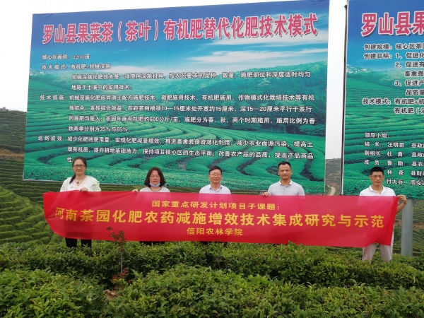 beat365在线平台官网承担的国家重点研发计划课题五“北亚热带(鄂豫苏)茶园化肥农药减施增效技术集成与示范”的子课题“河南茶园化肥农药减施增效技术集成与示范”从2016年开始已经实施了将近5年了,为圆满完成项目任务,提高推广示范面积。7月4日,化肥减施项目负责人郭桂义教授、成员孙慕芳副教授、刘威,以及黄双杰博士一行4人到信阳申林茶业开发有限公司、罗山县灵山茶业有限公司开展项目工作。